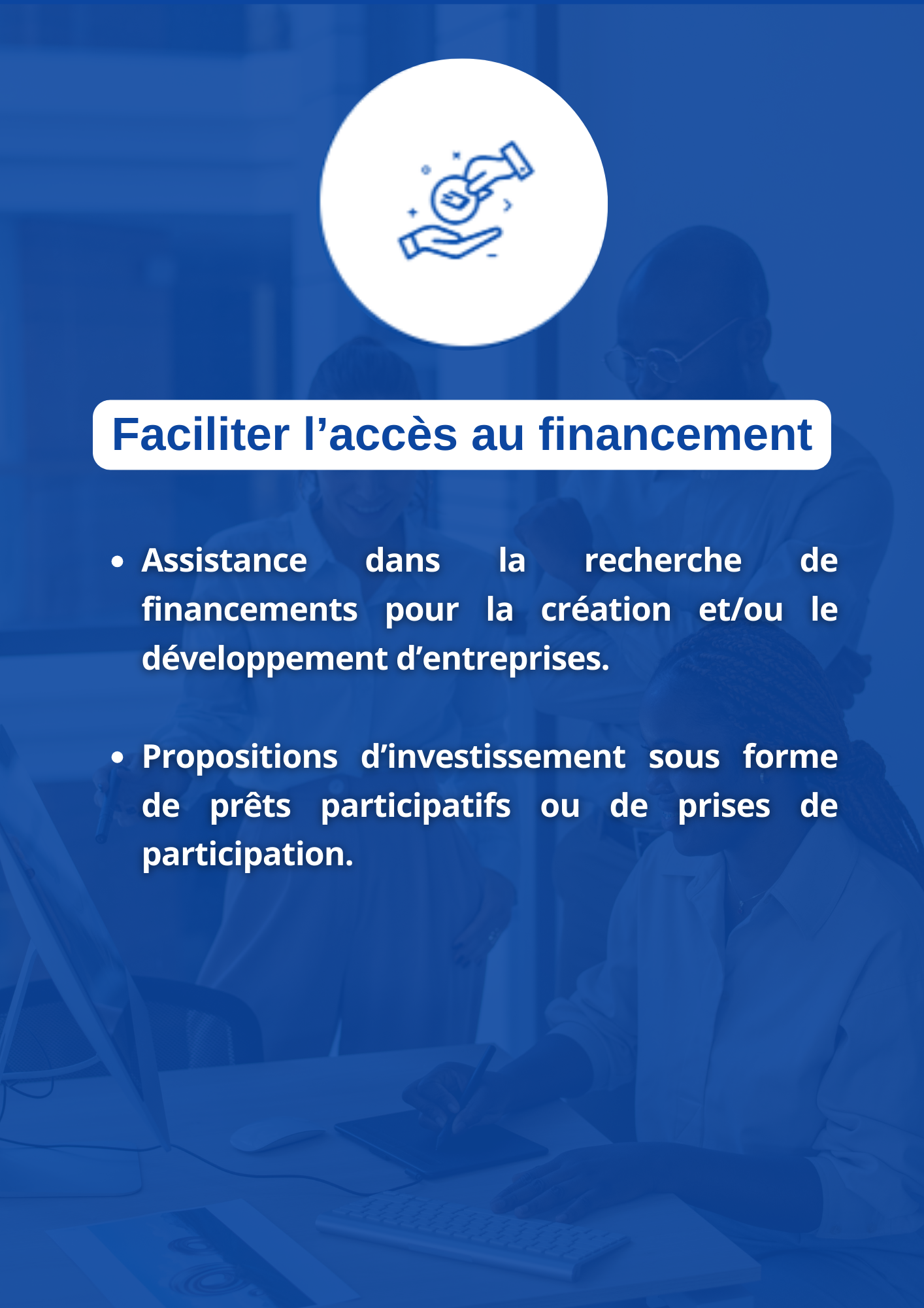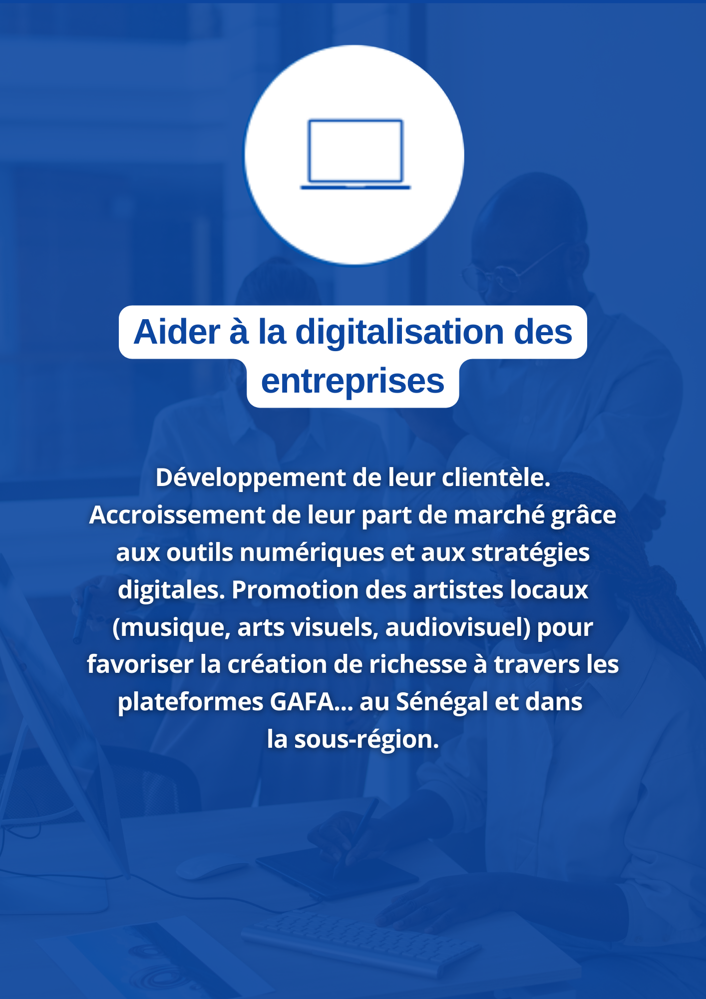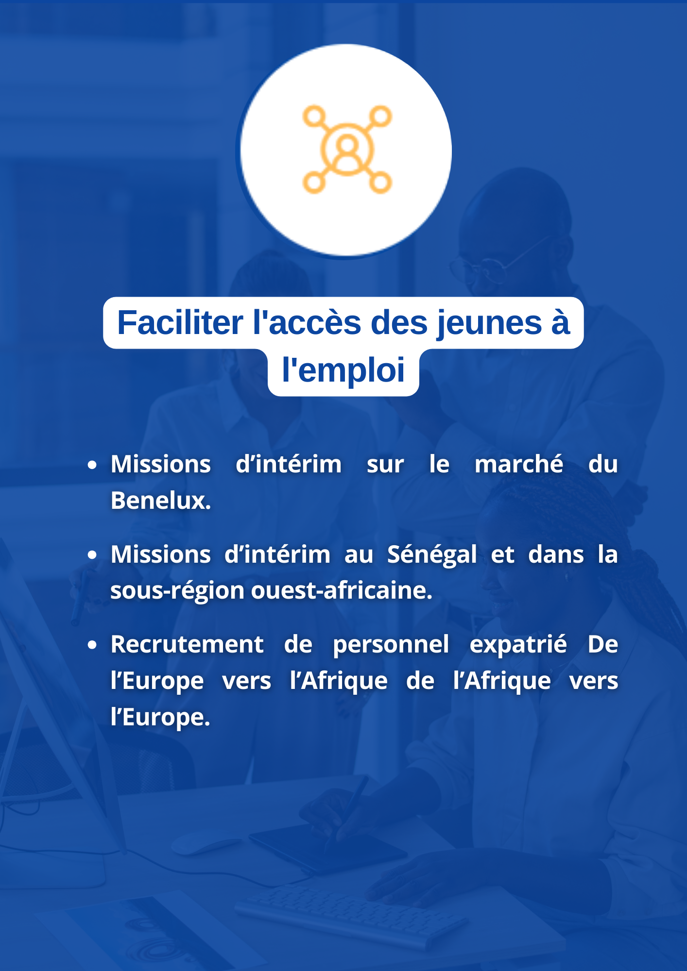 Faciliter les investissements et les initiatives économiques entre la diaspora et l’Afrique en offrant des solutions intégrées dans l’entrepreneuriat, l’accès au marché international, le numérique, le tourisme & évènementiel, l’emploi et le recrutement.