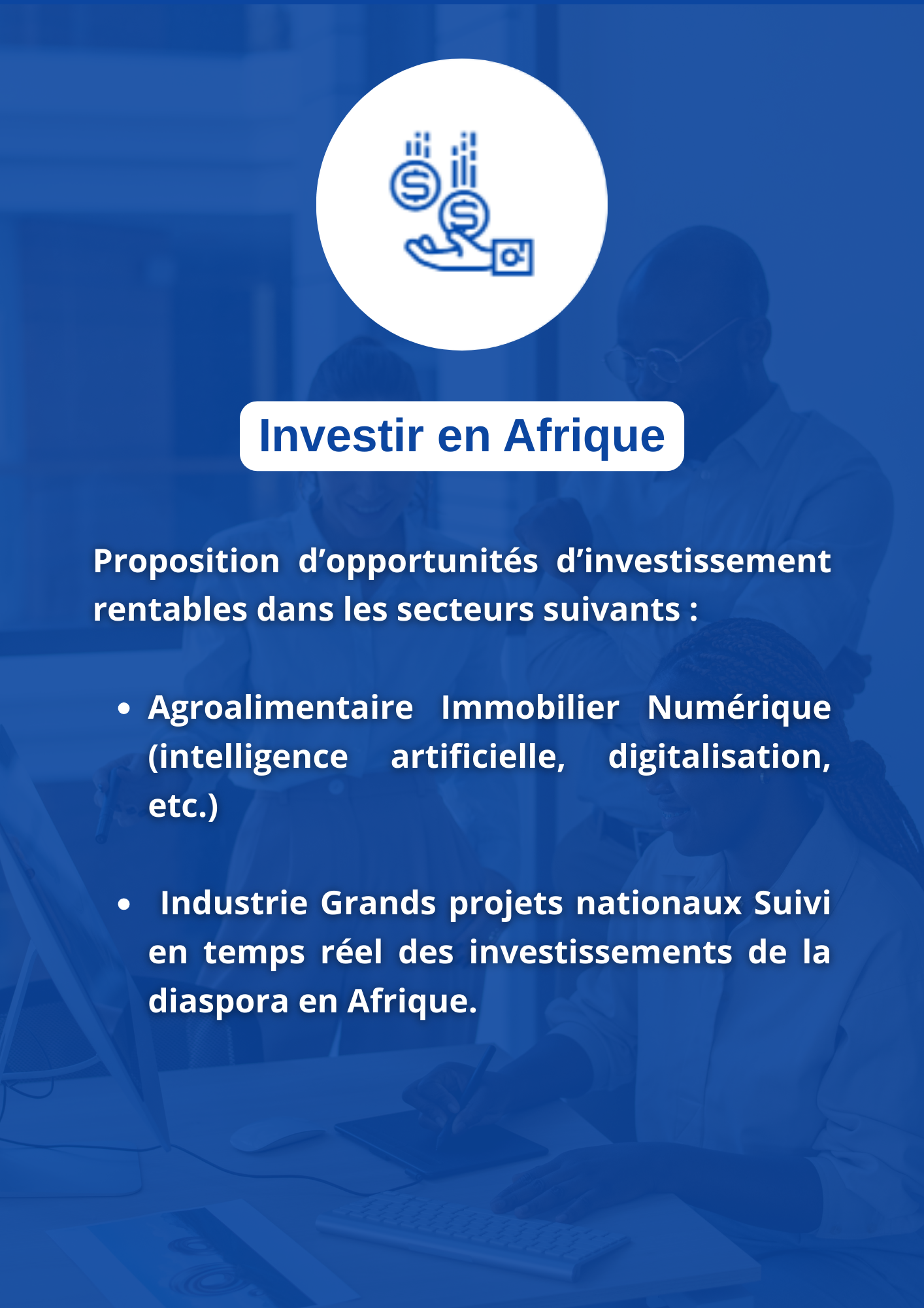 Nous sommes une société luxembourgeoises qui vise à faire profiter à la diaspora et aux entrepreneurs européens de l’énorme potentiel d’opportunités d’affaires dans tous les